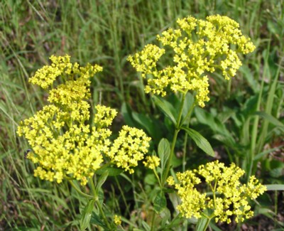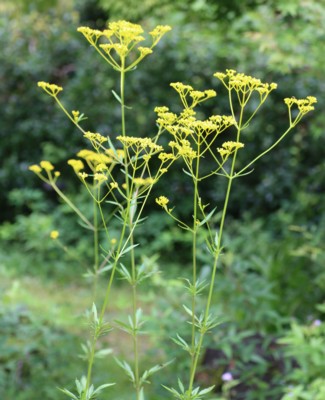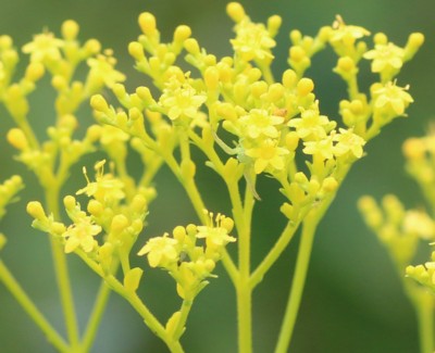 ・茎頂に黄色い花を散房状に多数つける。花は直径約4mm、花冠は5裂する。雄しべは4個、花柱は1個。