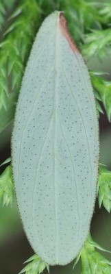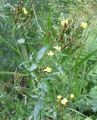・葉は対生し、長さ3〜6cm、幅0.7〜2cmの広披針形。基部はやや茎を抱き、黒点が多い。