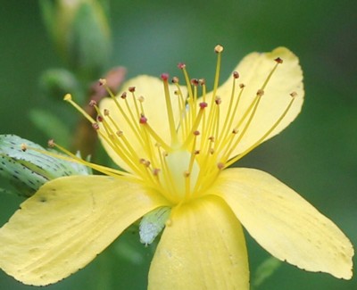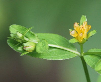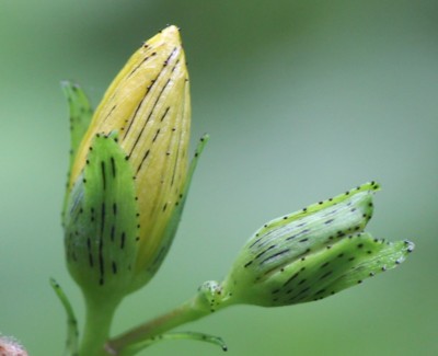 ・花は黄色で直径1.5〜2.5cmの5弁花。花弁と萼片に黒点と黒線がある。