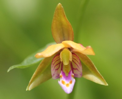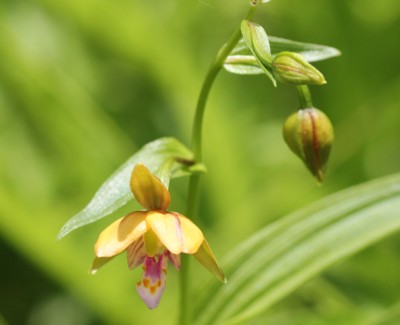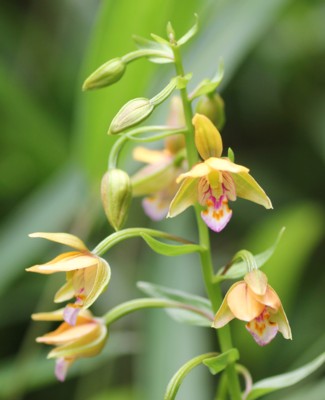 ・花は直径約2.5pで、側花弁は橙黄色、唇弁は内側に紅紫色の斑紋がある。