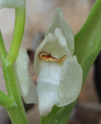 ・花は白色で長さ約1cm。唇弁基部の距は長さ3〜4mm、中裂片の隆起線は3個で黄褐色。
