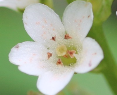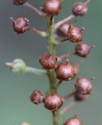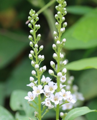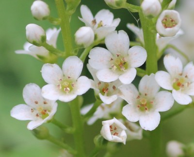 ・茎先に長さ10〜30cmの総状花序をだし、白い小さな花を多数つける。花冠は直径5〜6mm。花序は垂れずに直立する。