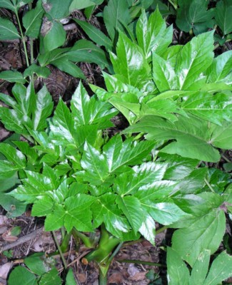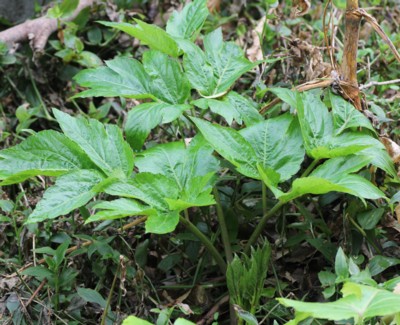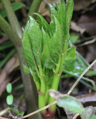 ・葉は2回3出羽状複葉で、葉柄の基部は袋状の鞘になる。小葉は広卵形で羽状に裂ける。