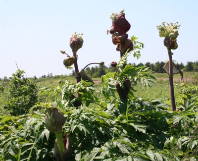 ・枝先に大形の複散形花序を出し、白色の小さな花を密につける。