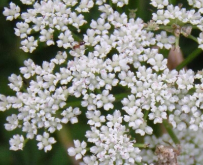・枝先の直径4〜6cmの複散形花序に、白色の小さな花をつける。