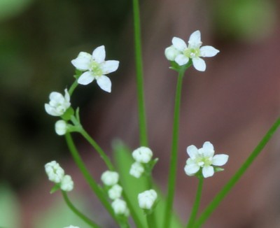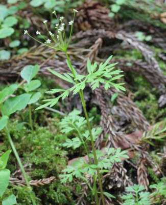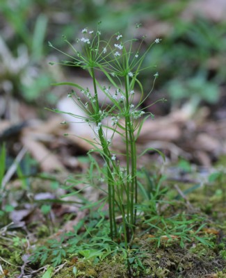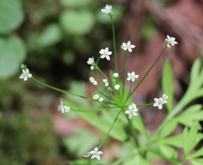 ・茎頂に一個の複散形花序を出し、2〜3個の花からなる散形花序を10数個つける。花は白色で花弁は5個。