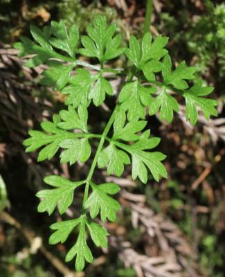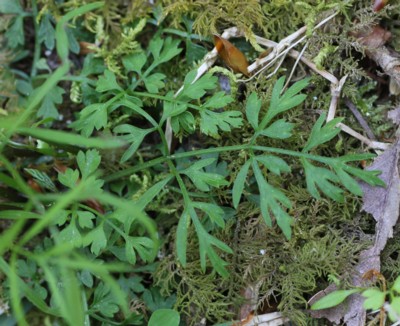 ・根生葉は2回3出複葉、小葉は深く切れ込む。茎葉は普通1個で、線形の羽状複葉。