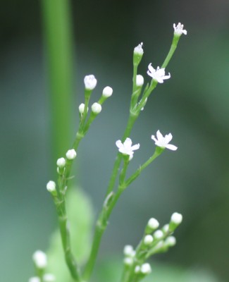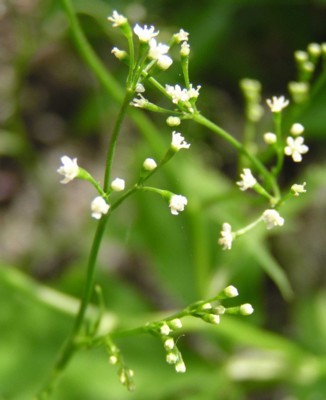 ・枝先から複散形花序をまばらに出し、白い小さな花をつける。