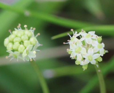 ・葉腋から葉よりも長い花柄を出し、先端に淡緑白色の小さな花を10数個つける。花弁5個、雄しべ5個、雌しべ1個。