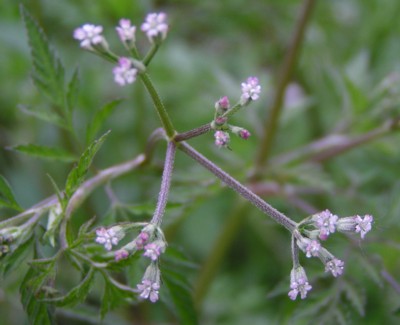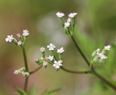 ・枝先に小形の複散形花序を出し、白っぽい、ピンクを帯びた小花をつける。