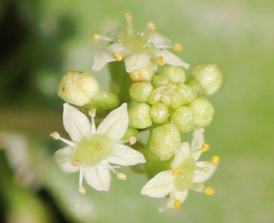 ・葉腋から花茎を伸ばし、短い柄のある花を数段輪生する。花は白色で直径約2mm、花弁は5個。