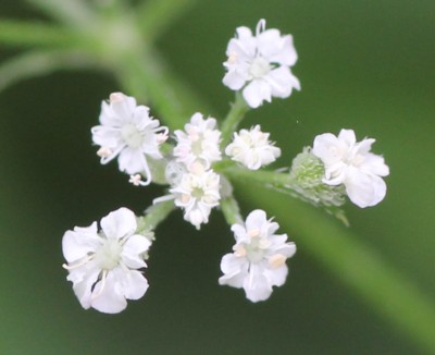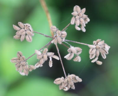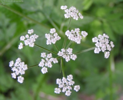 ・枝先に小形の複散形花序を出し、白色の小花をつける。小散形花序の小花は4〜10個。