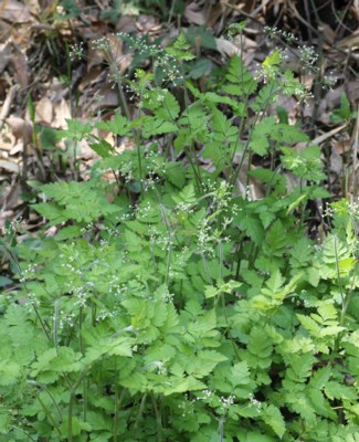 | ・枝先から複散形花序を出し、白色の花をまばらにつける。 |