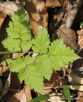 ・葉は長さ7〜30cmの2回3出羽状複葉。小葉は卵形で粗い鋸歯がある。