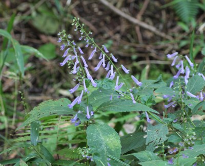 ・枝先や葉腋から花枝を出し、青紫色の花を総状につける。花は唇形、筒部は長く、上唇は4裂し下唇は舟形。