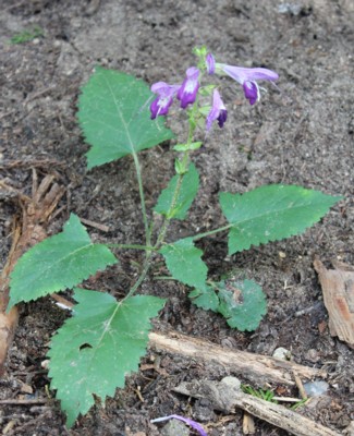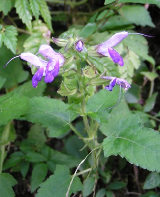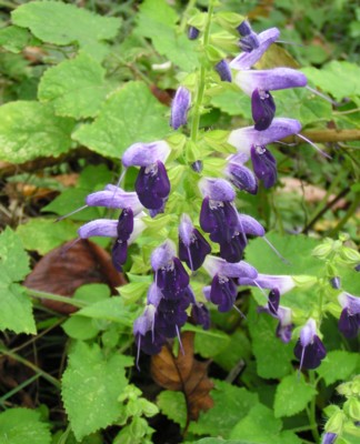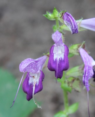 ・枝先に紫色の花を集まってつける。花冠は唇形で、雄しべは長く外へつき出す。