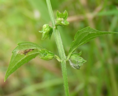 ・葉は対生し、長さ2〜4p、幅1〜2.5pの卵形〜広卵形。縁に粗い鋸歯があり、裏面には細かな腺点がある。