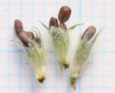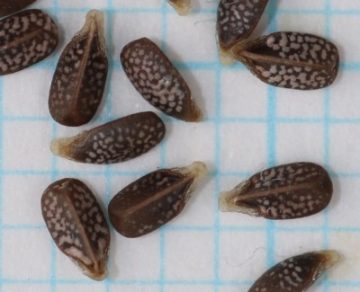 ・果実は分果(分離果)で4個できる。分果は長さ2mmほど、濃い褐色に白っぽい斑が多数ある。