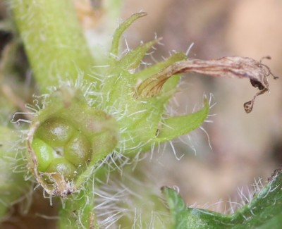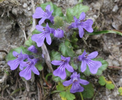 ・茎はまるく、地をはって広がり直立しない。全体に粗い毛があり、紫色を帯びる。