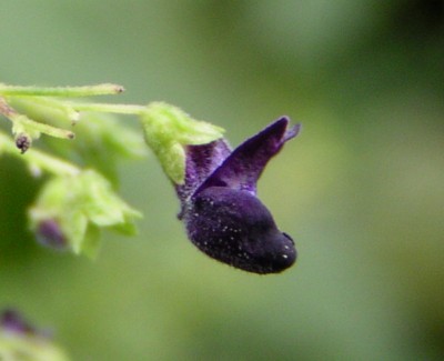 | ・花は長さ5〜6oの暗紫色。上唇は浅く4裂し、下唇は舟形。 |
