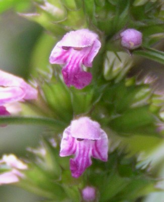 ・上部の葉腋に唇形の花を数個ずつつける。花冠は長さ1pほどで淡紅色。