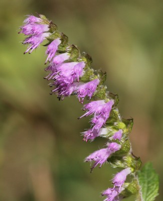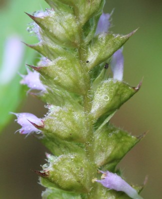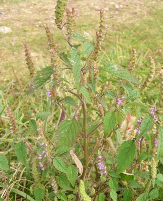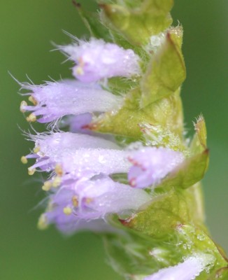 ・枝先に花穂を出し、唇形の小さな花を片側につける。花冠は淡紅紫色で、長さ約5oほど。