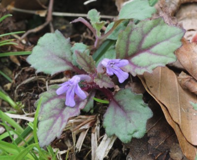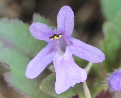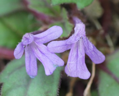・上部の葉腋に長さ約1cmの淡紫色の花を数個つける。花は唇形で上唇は2裂して小さく、下唇は大型で3裂する。