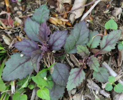 ・葉は対生し、長さ2〜6cm、幅1〜3cmの長倒卵形。粗い鈍頭の鋸歯がある。表面は脈に沿って紫色になり、裏面は紫色を帯びる。