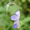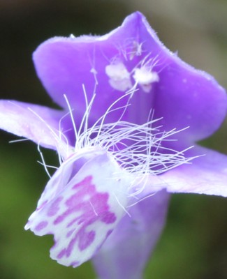 | ・花冠は長さ4〜5cmで紫色。下唇の中央裂片は大きく、濃い紫色の斑点と長毛がある。 |