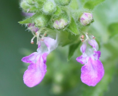 | ・花冠は長さ8〜10mmで上唇は小さく、下唇は長く突き出る。がくは腺毛が密生し、5裂する。 |