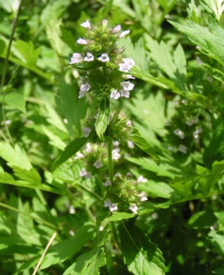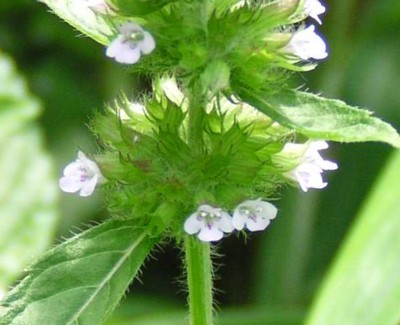 ・茎先に花穂を出し、唇形の花を数段輪生する。花冠は長さ5〜6mmで白色またはわずかに淡紅色を帯びる。