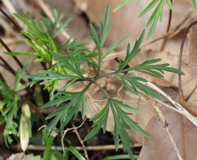 | ・葉は3全裂し、側裂片はさらに全裂して5全裂状になる。小葉はさらに細かく切れ込む。 |