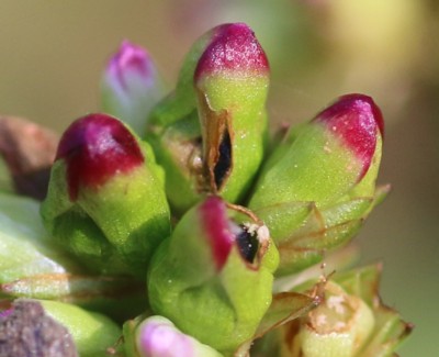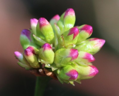 ・枝先に10数個の小さい花を集まってつける。花被は5深裂して、上部は淡紅色。