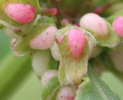 ・花のあと、内花被片は翼状になり痩果を包み、中央のこぶ突起は大きくてよく目立つ。