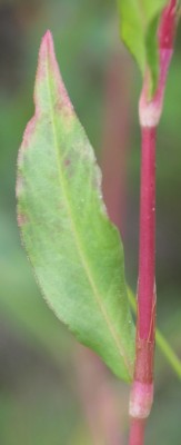 ・葉は互生し、長さ3〜8cm、幅1〜2.5cmの広披針形。