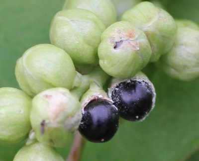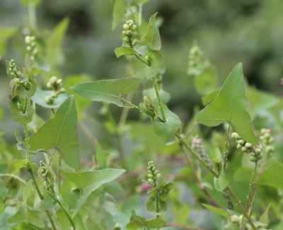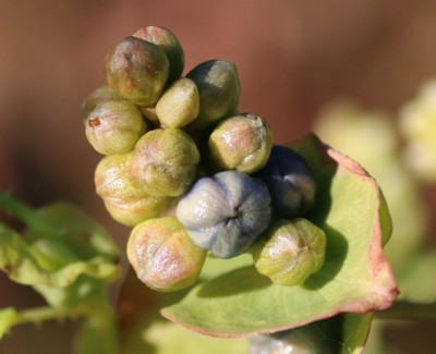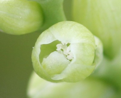 ・茎先や葉腋に短い総状花序を出し、小さな淡緑色の花を10〜20個つける。花序の基部には丸い葉状の苞がある。