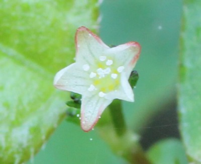 ・上部の葉腋から二叉状の柄を出し、白色または先が紅色を帯びた花を数個つける。