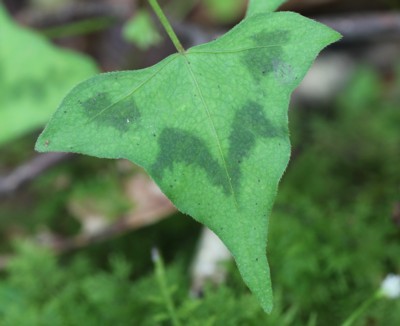 ・葉は互生、長さ2〜5pの三角形で、表面にハの字状の黒班がある。下部のものは長い柄があり、上部のものは無柄。