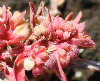 ・枝の上部の葉腋に淡紅紫色の杯状花序をつける。