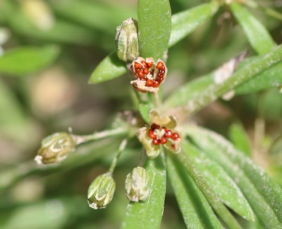 | ・葉腋に小さな花を数個固めてつける。花弁はなく蕚片が花弁のように見える。 |