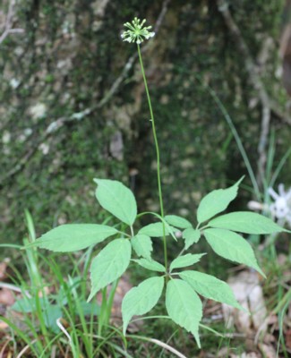 | ・茎は直立し、頂に長い柄のある葉を3〜5個輪生する。葉は5小葉からなる掌状複葉、小葉は卵形〜披針形で縁に鋸歯がある。 |