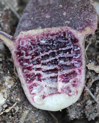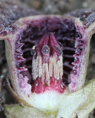 カンアオイ属は萼筒内部の隆起線の数が見分けるポイントのようなので、ナイフで切って撮影しました。写真は、図鑑に載ってるものとは数が多いようです。千葉県〜静岡県に分布する「カンアオイ(A.