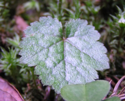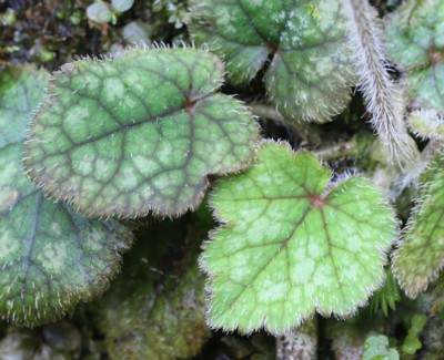 ・葉は根生し、長さ4〜8p、幅3〜5pの広卵形で基部は心形。