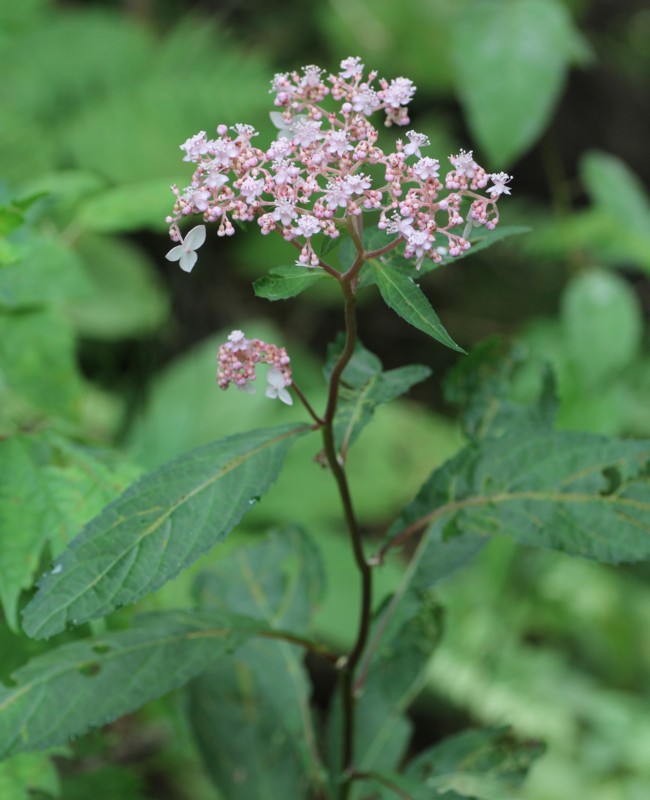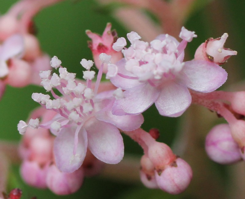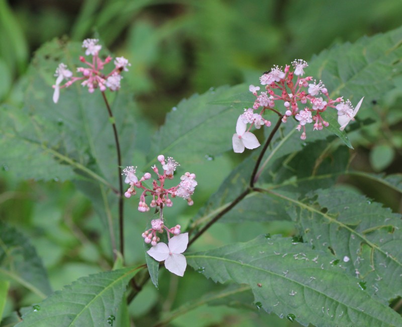・茎頂に淡紅色を帯びた両性花と装飾花をつける。