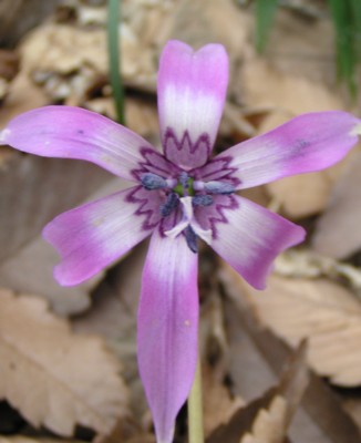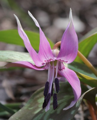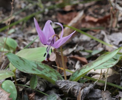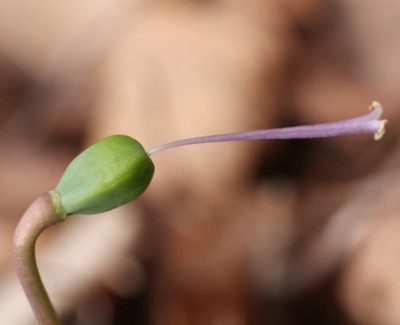 ・花茎は20〜30cm、茎頂に淡紫色の花を1個、下向きにつける。
