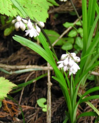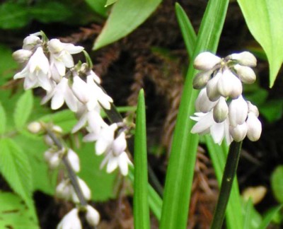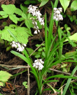 ・花茎は高さ15〜30cmで、上部に総状の花序をつける。花は直径約1cm、白色または淡紫色で下向きに咲く。
