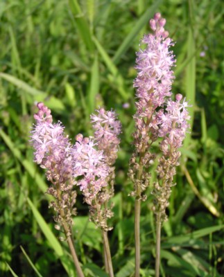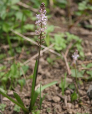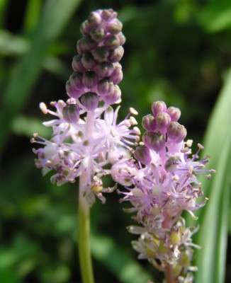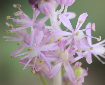 ・高さ20〜40pの花茎を出し、上部に淡紅紫色の花を総状につける。花被片は6個、長さ3〜4oで平らに開く。