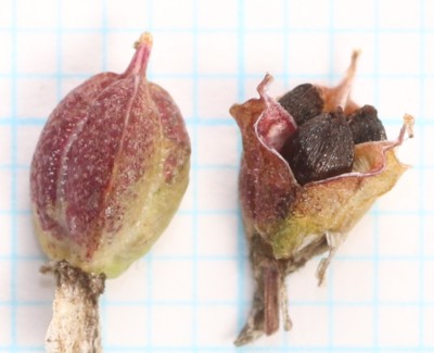 ・果実は刮ハ。長さ5mmほどの倒卵形または楕円形で3稜がある。熟すと先が開き種子を落とす。