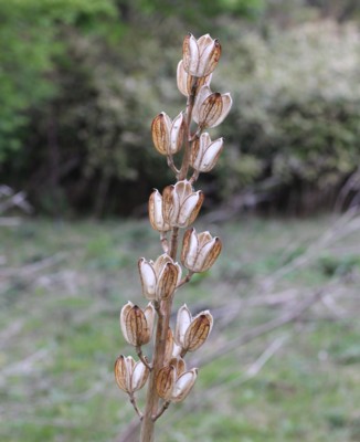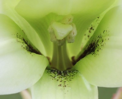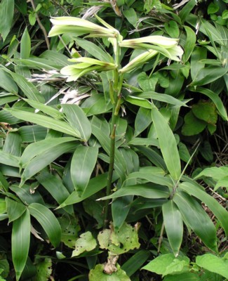 ・茎の上部に長さ12〜17cmの緑白色の花を横向きにつける。