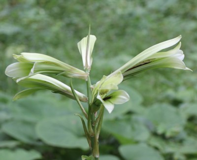 独立したウバユリ属(Cardiocrinum)とする考えもあります。中部以北や北海道には大型の「オオウバユリ」がある。